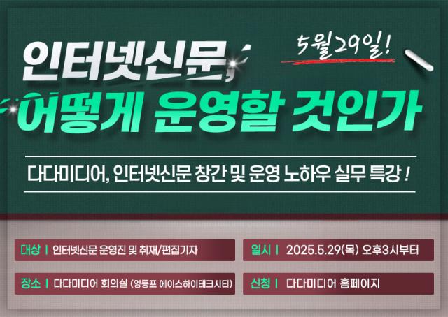 인터넷신문 제작 전문 기업 다다미디어가 오는 5월 29일(목) 서울 본사 회의실에서 인터넷신문 창간 예정자와 운영자를 위한 실무 특강 ‘인터넷신문, 어떻게 운영할 것인가’를 개최한다.
