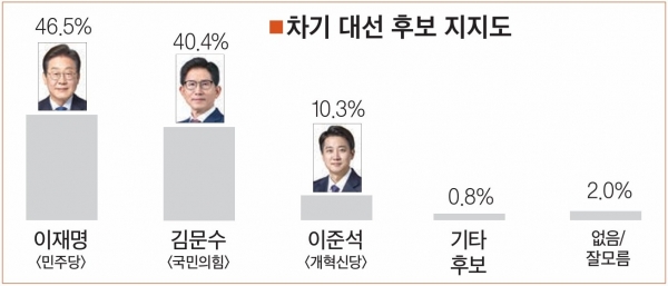 이재명 더불어민주당 후보와 김문수 국민의힘 후보 간 지지율 격차가 6.1%포인트로 나타났다.