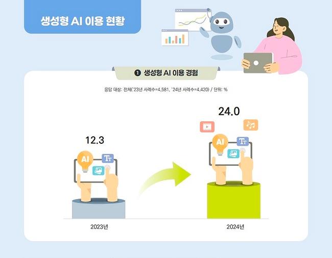 조사 결과, 전체 응답자의 24%가 생성형 AI를 이용한 경험이 있다고 밝혀 전년 대비 11.7%p 상승했다. 유료 구독 경험도 7%로 전년 대비 7배가량 증가해 생성형 AI의 대중적 확산세가 확인됐다.