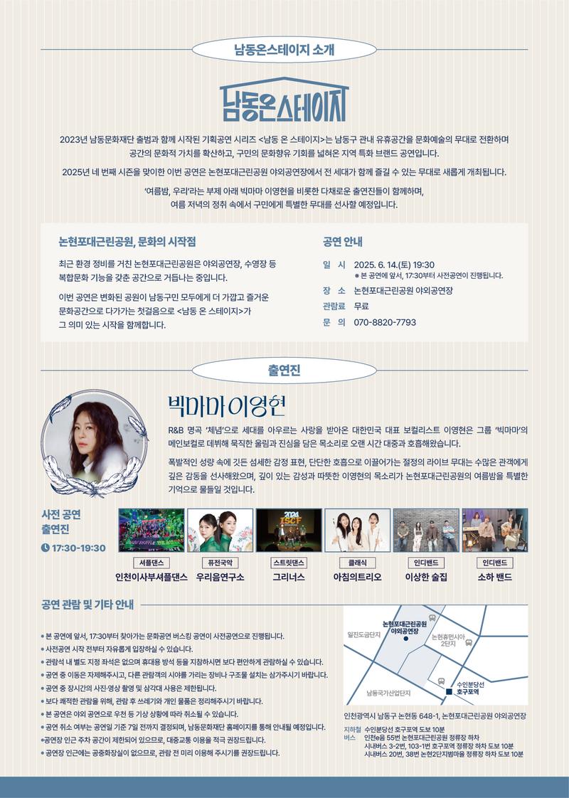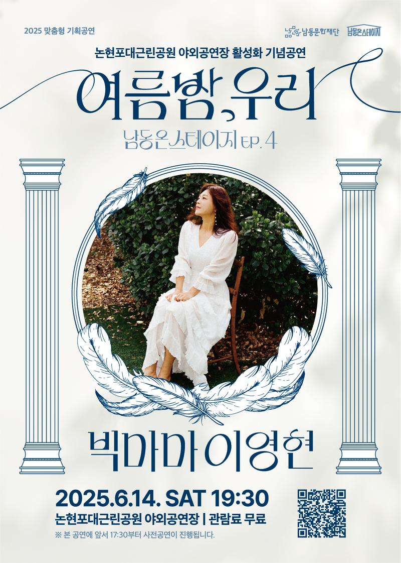 남동문화재단 김재열 대표이사는 “논현포대근린공원과 야외공연장이 더욱 활성화되기를 바라며, 이번 공연이 구민 여러분의 여름밤에 오래 남는 한 장면으로 기억되기를 기대한다”라고 말했다.