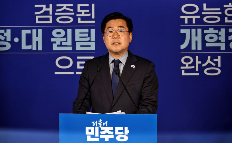 그는 준비된 선언문을 읽던 중 감정이 복받친 듯 울먹이는 모습을 보이기도 했다. 그러면서 “원팀으로 이재명 정부와 민주당에 부여된 과제들을 척척 완수해 내겠다”며 “이재명·박찬대 원팀,