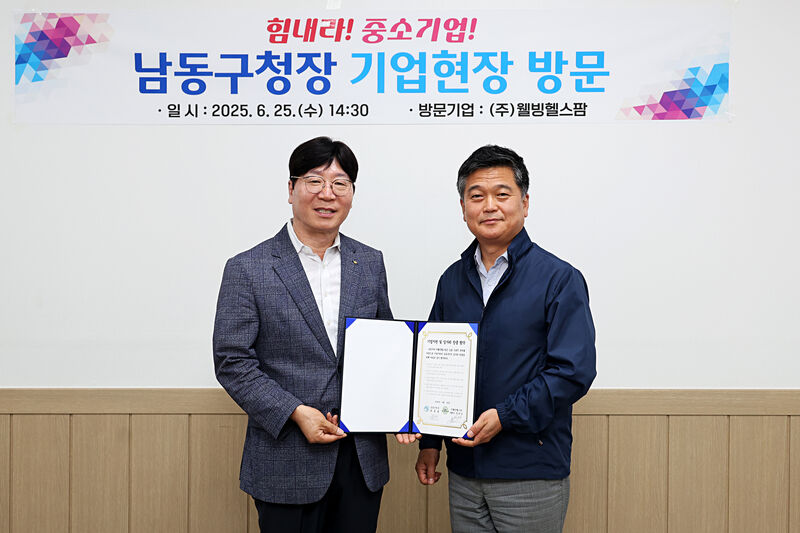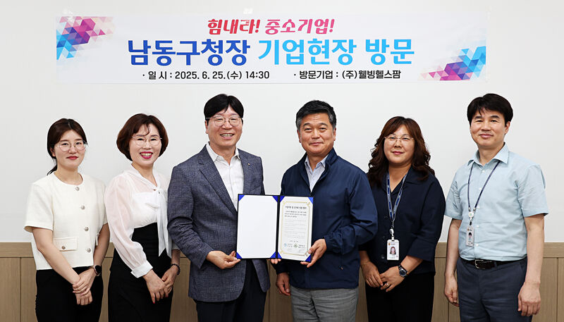 인천 남동구(구청장 박종효)는 6월 25일(수) 화장품 제조업체 (주)웰빙헬스팜(대표 박진수)을 방문해 애로사항 및 건의사항을 청취하고 현장 관계자를 격려했다. 또한, 1기업 1구민 일자리 창출 협약을 체결했다.