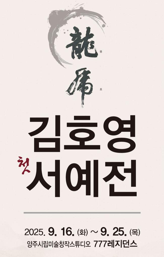 양주시, 혜강 김호용 작가 첫 번째 개인전 《용호 龍虎》 개최.전시는 9월 16일부터 25일까지 양주시립미술창작스튜디오 3층 갤러리에서 열린다. 이번 전시는 매년 진행되는 양주시 대관 공모 프로그램의 일환으로, 지역 예술가 창작 지원과 문화예술 활성화를 목표로 마련됐다.
