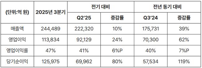SK하이닉스는 29일 2025년 3분기 경영실적 발표를 통해 매출 24조 4,489억 원, 영업이익 11조 3,834억 원, 순이익 12조 5,975억 원을 기록하며 HBM과 고성능 서버용 메모리 수요 증가에 힘입어 창사 이래 최대 분기 실적을 달성했다고 밝혔다.