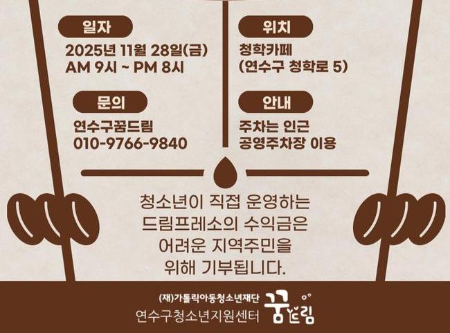 연수구학교밖청소년지원센터 `꿈드림`(센터장 이은선)은 오는 28일 청학카페(청학로 5)에서 학교 밖 청소년이 직접 운영하는 일일 카페 `드림프레스`를 연다.