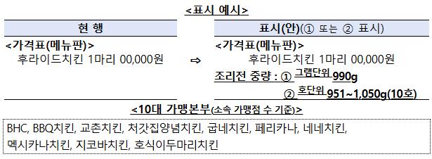 우선 식약처는 12월 15일부터 치킨을 판매하는 10대 프랜차이즈 가맹점 약 1만2,560곳을 대상으로 ‘조리 전 총 중량’ 표시를 의무화한다. 메뉴판과 배달앱, 웹페이지 등 가격 표시 옆에 그램( g ) 또는 ‘호(號)’ 단위로 표기하는 방식이다. 외식업계 특성상 모든 업체에 일률 적용하기 어렵다는 점을 고려해 대규모 가맹본부 소속 가맹점만 우선 적용했다.
