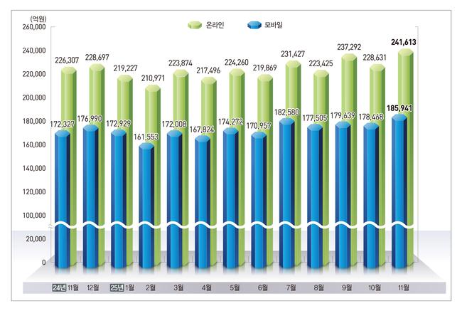 11월 온라인쇼핑 24조원 돌파…음식·식료품이 성장 견인 - 전년 동월 대비 6.8% 증가하며 거래액 24조1천억 원 기록 - 음식서비스·음식료품·여행교통 서비스 중심으로 소비 확대 - 모바일 거래 비중 77%…전년보다 0.9%p 상승