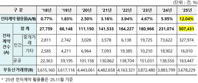국토교통부는 지난해 부동산 전자계약 체결 건수가 50만7,431건으로 전년 대비 2배 이상 늘고 활용률도 12.04%로 처음 10%대를 넘겼다며, 전세사기 예방과 금융 혜택 등 실질적 장점이 확산을 이끌고 있다고 밝혔다.