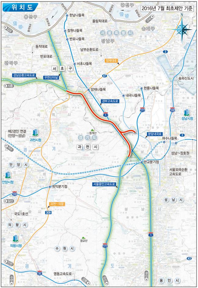 노선은 경부고속도로와 용인서울고속도로가 만나는 판교 인근에서 우면산터널까지 약 10.7km 구간으로, 왕복 4차로로 조성된다. 추정 사업비는 5,612억 원으로, 2016년 4월 1일 가격 기준이다. 완공 시 성남·판교에서 서초·강남권으로 이동 시간이 단축되고, 기존 경부고속도로의 병목 현상도 완화될 것으로 기대된다.