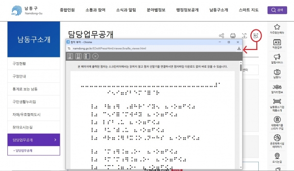 박종효 구청장 인천 최초 ‘남동구, 홈페이지 전자점자 서비스’ 도입 알려