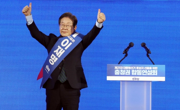 이재명 더불어민주당 대선 경선 후보는 19일 첫 순회경선지인 충청권 합동연설회에서 “저 이재명이 김대중·노무현·문재인의 뒤를 이어 네 번째 민주정부를 수립하겠다”며 “이재명에게 기회를 달라”라고 호소했다.