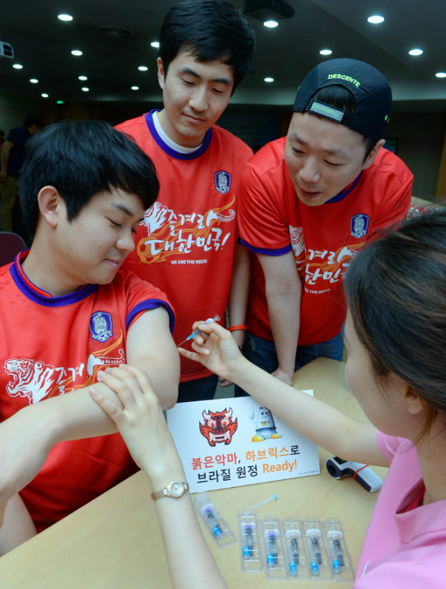 글락소 스미스클라인은 브라질 월드컵 개막을 앞두고 현지 원정 응원에 나서는 국가대표팀 서포터즈 붉은악마 110명을 대상으로 A형 간염 예방 백신 하브릭스 접종을 무상 지원한다고 밝혔다. (사진제공: 글락소스미스클라인)
