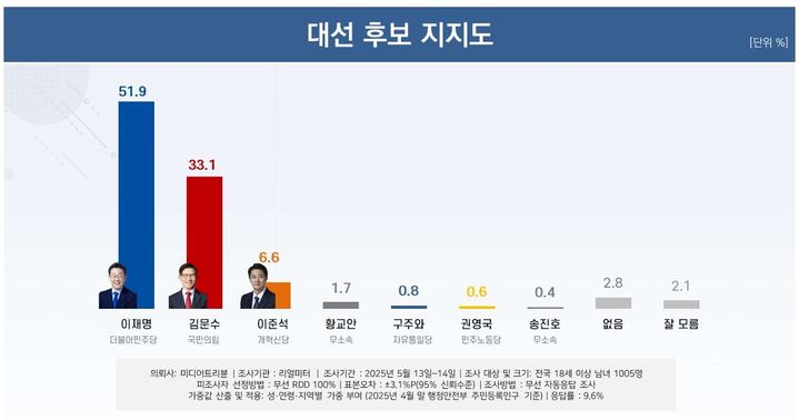 이재명 51.9% 김문수 33.1% 이준석 6.6%[리얼미터]