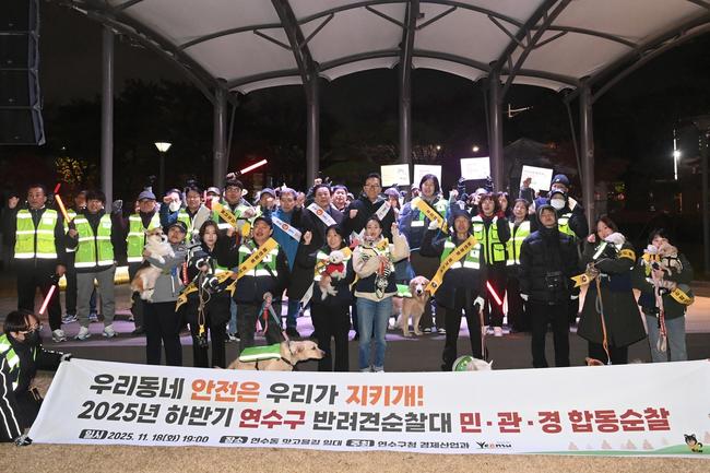 연수구(구청장 이재호)는 지난 18일 반려견 순찰대(일명 연수지킴댕댕이), 연수2동·동춘3동 자율방범대, 인천경찰청 기동순찰대 등 50여 명이 참여한 `민·관·경 야간 합동 순찰`을 진행했다.