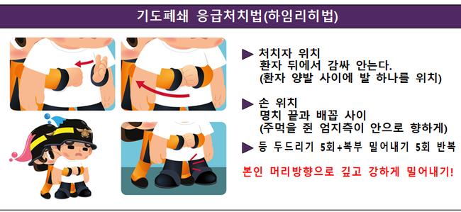 소방청은 사고 발생 시 신속한 응급처치의 중요성을 강조했다. 기도폐쇄 응급처치법인 하임리히법은 환자 뒤에서 감싸 안고 명치 끝과 배꼽 사이를 주먹으로 힘껏 밀어 올려 기도에 걸린 이물을 배출하는 방식이다. 등 두드리기와 복부 밀어내기를 반복해 시행하는 것이 핵심이다.
