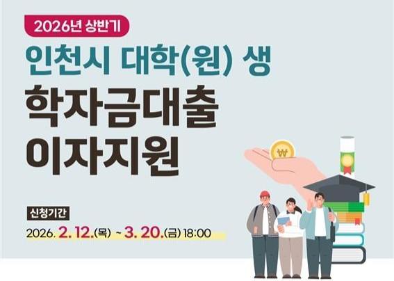 인천광역시(시장 유정복)는 대학(원)생의 학자금대출 이자 부담을 완화하기 위해 2026년 상반기 학자금대출 이자 지원 신청을 오는 2월 12일부터 접수한다고 밝혔다.
